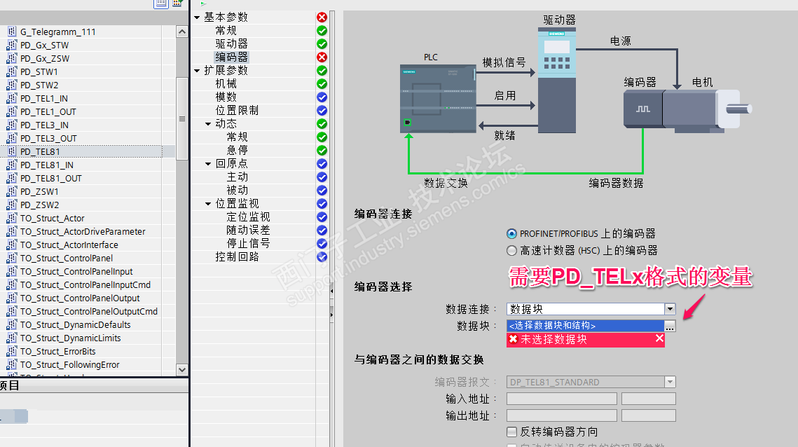 现在组态上,卡在了编码器这一项,需要建立个PD_TELx类型的数据,现在自动生成的数据类型只有PD_TEL81_IN与PD_TEL81_Out;