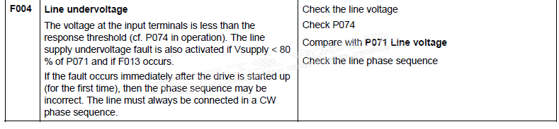 如果出现故障F04,检查主电源旋转方向,检查主接触器的接触和检查电源电压。