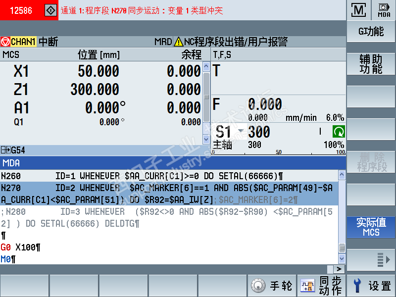如果把 N260 ID=1 后面加上$AC_MARKER[6]==1 AND 那么也和N270程序段一样报错。