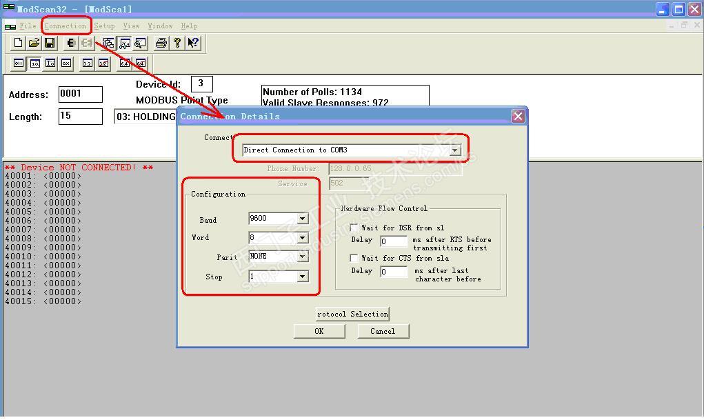 打开ModScan32软件,在Connection(连接)选择通讯驱动及通讯参数,ModScan32通讯参数与plc侧必须一致,(通讯频率9600、数据位8、校验无、停止位1)与modbus rtu一致,“ok”确认。ModScan32软件设置与plc侧一致的从站号3,通讯数据长度15等。