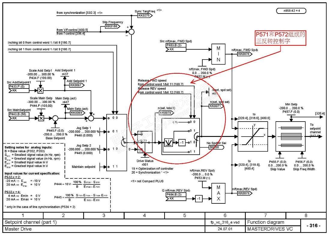 从驱动控制器这边来讲(6SE70),实现正反转的途径就是两个,一个是通过正反转的控制字置1或0实现,还有一个是把转速设定值的极性取反实现。
