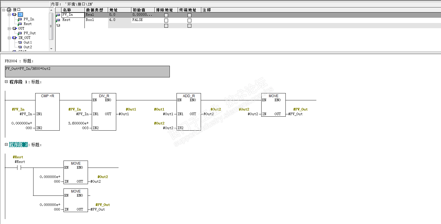 用300PLC实现流量累计,我写的如附件所示,程序在FB2004里面,PV_In为瞬时流量,PV_Out为累计输出,在OB35里面调用FB2004,OB35的中断时间为100ms,但是这样累计和流量计表头上显示的累计有偏差,各位大侠有没有简单实用,偏差小的案例,求指教。
