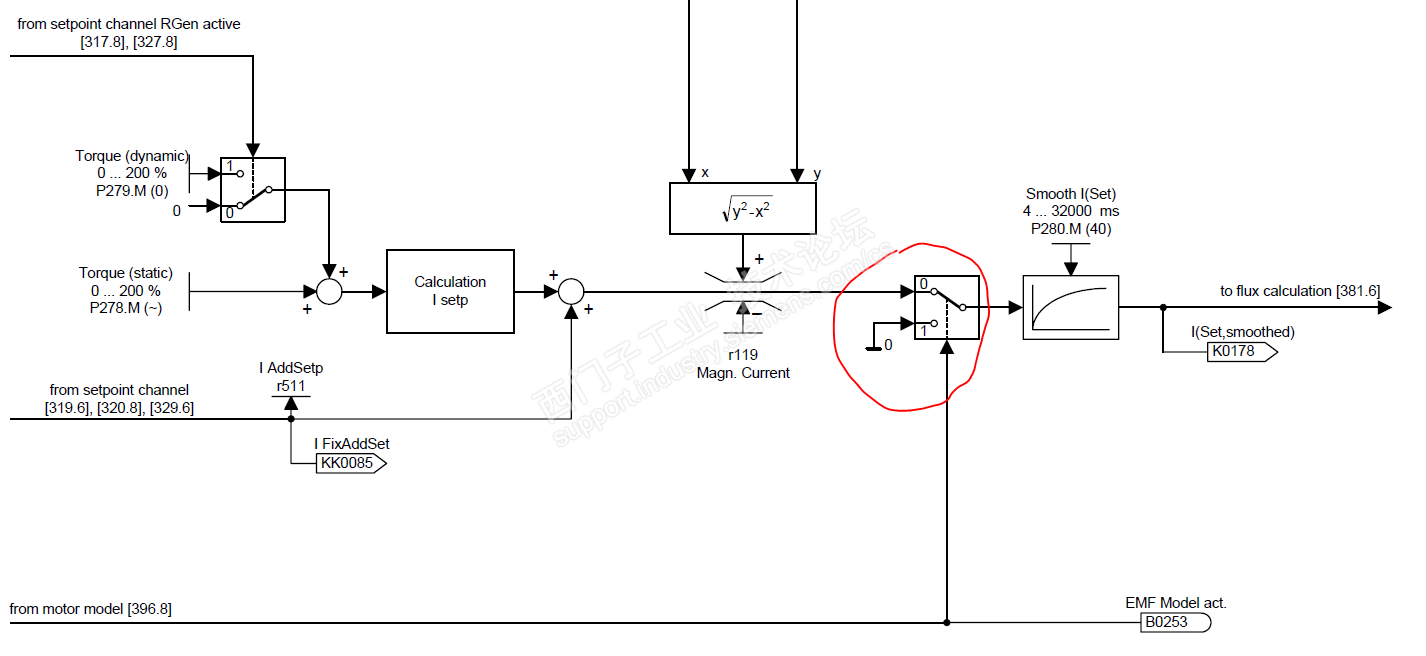 P313现在是5,那就是说在2.8HZ后,会变为EMF模式,P278,P279也就起不了作用了,所以提高P313就会有改善,如改为10HZ,这时切换点会在5.7HZ。(不知道这样理解对不对);