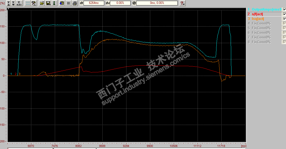 今天 把P313 EMF频率由5改到13,没有速度上的停顿了,但从曲线 上看,速度 还是有点掉下来的。
