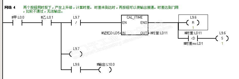 这上面citime后面跟一个复位,不管是不是要接通都复位。常规做法是比较不对的话复位,比较确认的话置位。但是觉得比较指令比较费时,肯定比一条复位指令费时,所以才把复位做成持久接通。然后再看比较,有比较结果之后再决定是否要接通输出。这堆东西如果不执行的话L9.6不会改变。目的就是用一个位去记录曾经发生的事情。就不用耗一个D去记录当时的时差值。