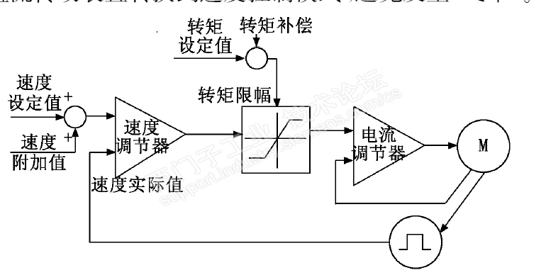 如上图所示:在电机的速度设定值中加入附加给定速度(此附加给定速度与速度设定值之和仍为正),使电机的实际速度反馈值始终不等于速度设定值,则速度调节器就会进入饱和状态,电机进入转矩控制模式,此时电机的输出转矩也就是转矩限幅值,这样也可以有效防止飞车现象的发生。