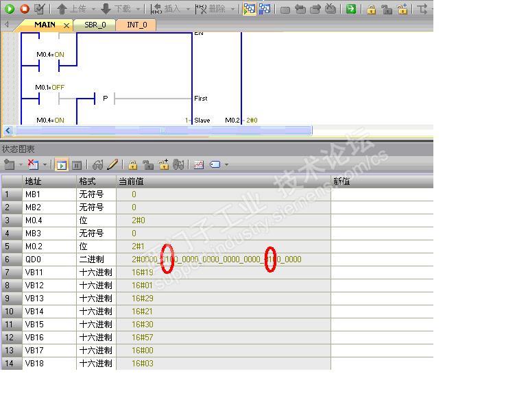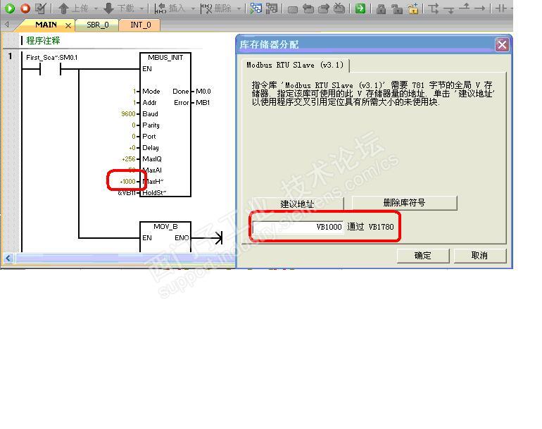 MaxHold管脚数量是指,HoldStart保存寄存器区的起始地址开始的连续字节个数,我的程序自VB11开始的1000个字,很显然超过到库存储器分配的起始地址VB1000了。这时,MBUS_INIT初始化指令错误报警5(库存储分配保持寄存器与modbus从站符合重叠),MBUS_SLAVE运行指令错误报警10(从站功能未启用),这个容易理解。初始化都未通过,从站怎么能够建立,修改程序不在范围下载后,通讯正常工作。