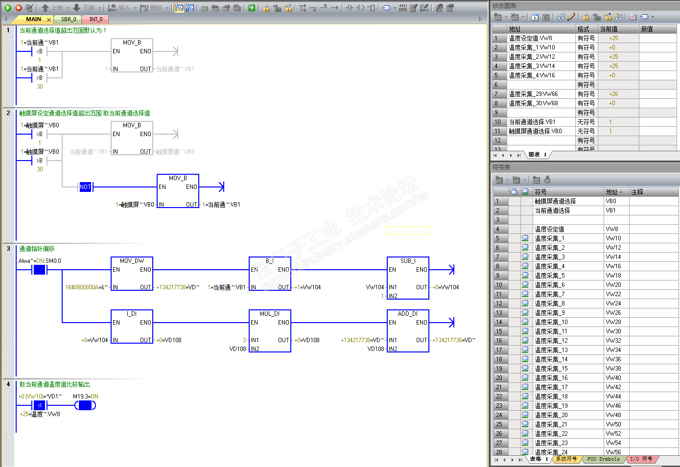 然后在PLC上,判断VB0是否超出传感器数量范围,如果不超出直接把VB0给VB1,然后用判断指令判断VB1=1就MOV传感器1给当前温度值,VB1=2就MOV传感器2给当前温度值依此类推.....