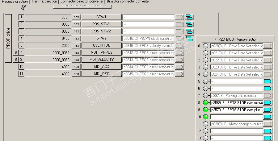 然后在stater中,也做了配置 STW2的第8位赋值给参数P2569 STW2的第9位赋值给参数P2570