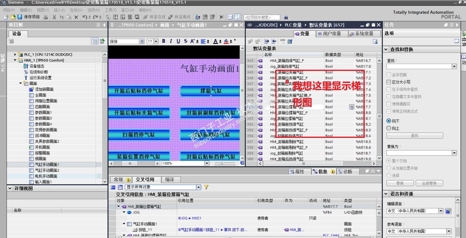 触摸屏按钮之类的不是关联变量嘛,我是想触摸屏和梯形图显示在一个面上,我知道拆分,但我使用交叉应用始终调不出梯形图界面,我问的是这个?