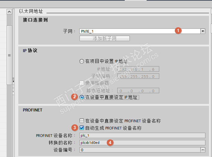 (2)设置IP地址和项目名称,注意一定要选择“在设备中直接设定IP地址",如图1所示。