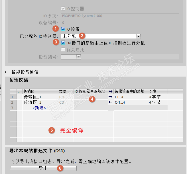 (3)操作模式配置为“IO设备”,注意一定要勾选“PNIO接口的参数由上位IO控制器进行分配”,还有“已分配的IO控制器”选择“未分配”。然后在传输区域配置与I0控制器的数据交换地址,全部编译后导出GSD文件,如图2所示。