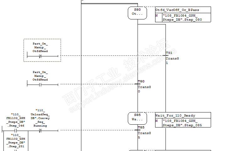 如下图,S80下边分成了两个分支,如果第一次扫描的时候,左侧条件满足,程序走到S85位置,但是这时候从S85走到下一步的条件不满足,那么程序将会在此处等待,第二次扫描的时候如果右侧的条件满足了,程序会继续等待S85条件满足继续下一步,还是会从右侧的程序直接跳过S85?