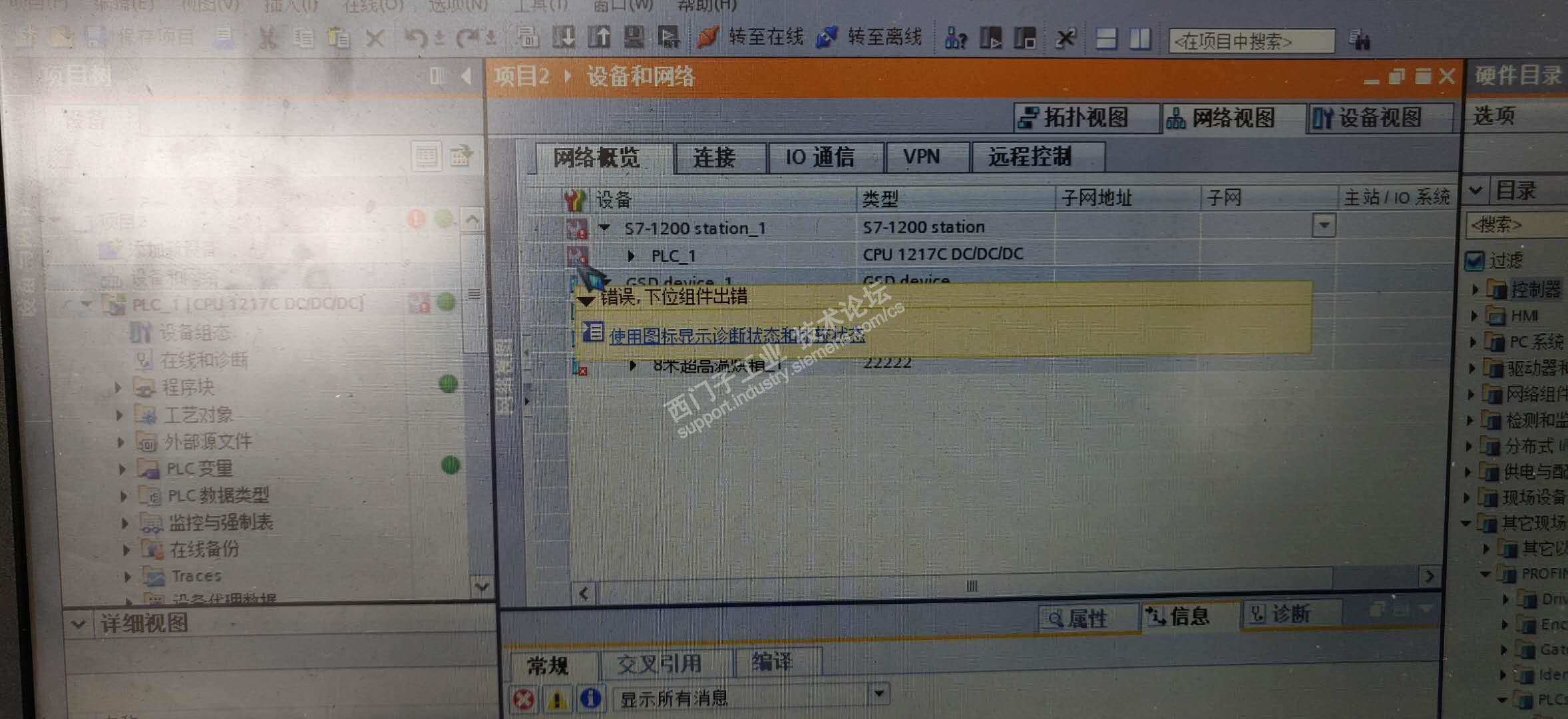 哪位大佬能告诉我一下,我cpu1217和两个cpu1215plc,进行profinet通讯,为什么会报错,为找不到io设备,两个gsd文件不能使用,显示“不可用”,(扳手小图标)处显示下位组件出错