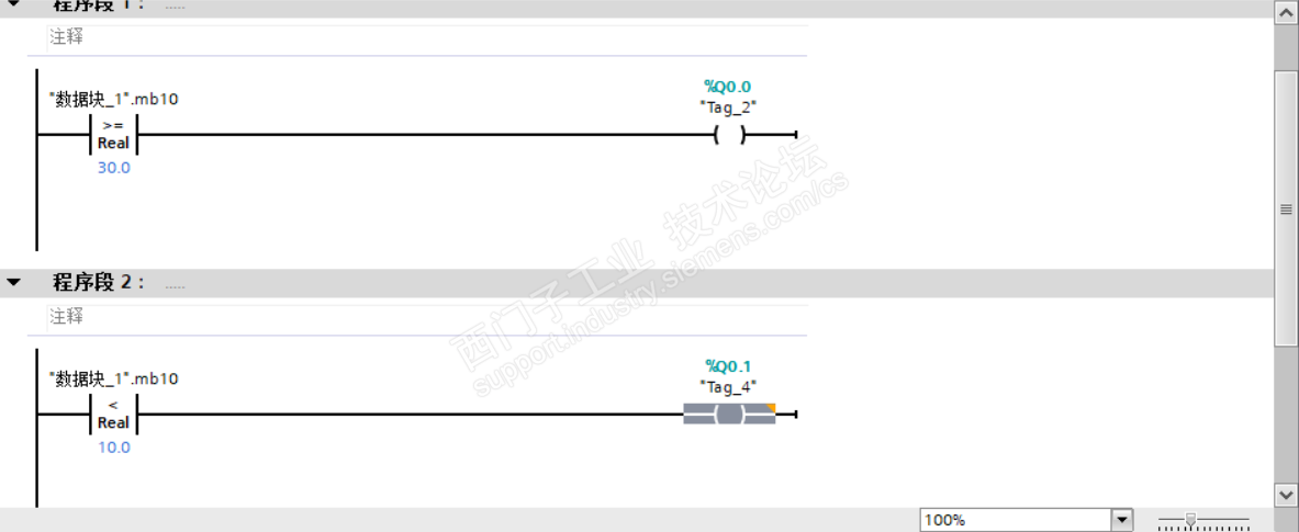 通过 PLCSIM 仿真水位报警,完成下列功能:a.在 OB1中编写程序,定义 MB10 为水位高度,当 MB10≥30时输出高报警 Q0.0 为 1,当MB10<10时输出低报警 Q0.1 为 1; b. 新建序列表,对变量 MB10 在 30s, 60s 两个不同的时间点分别赋值10,30; c.在OB1中监视 Q0.0 和 Q0.1的状态。