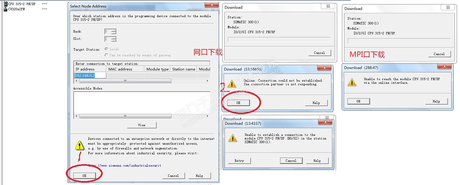 请教一下,一个新买的315-2PN/DP的CPU,在硬件组态里建立了DP和PN网络,并编了一些程序。一开始下载程序时用网线下载,发现报错下不进去;然后找了根编程电缆,PG/PC接口里选择MPI,还是报错下不进去;最后PG/PC接口里改成DP,就下进去了。具体如下图所示。请问这是什么原因啊
