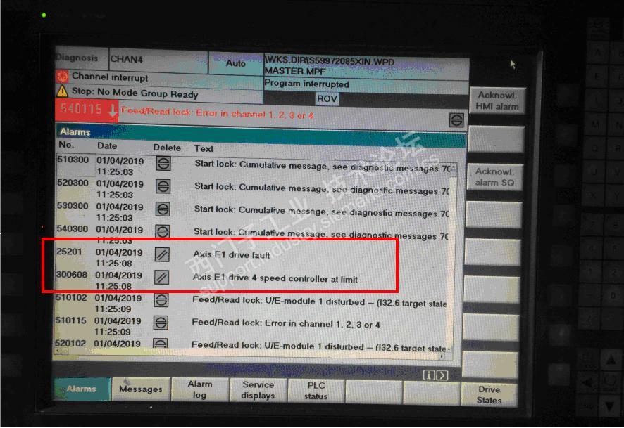 根据周末同事维修经历,主要问题锁定在25201#、300608#故障。51012#及其它信息根据用户PLC程序判断为E1轴故障后的保护性措施。