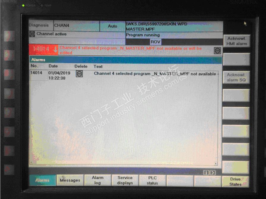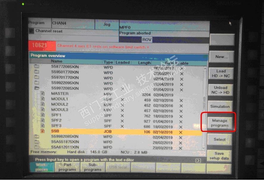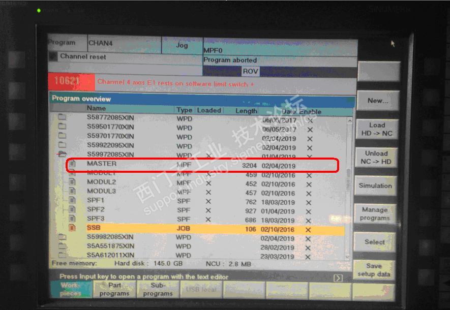 第二天,一早匆匆忙忙买了一点早餐赶往公司。在NCK程序选择界面下,看到有一个按钮,Manage programs,将光标移动到MASTER_MPF处,按下Manage programs按钮,主程序加载成功,图示:操作前的画面。