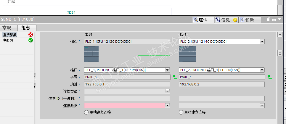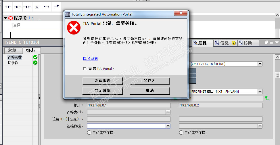 在组态TSEND_C新建连接数据时,博图软件会出错?如下图