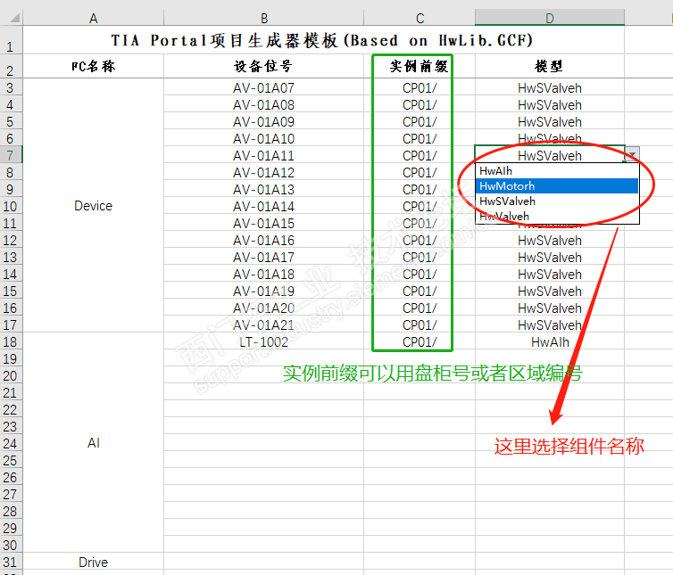 为此我们开发了一款基于HwLib.GCF的程序生成器,它的思路是这样的,首先我们在Excel模板中完成对程序结构的配置,然后开发一款软件来读取Excel模板中的数据,再根据TIA Portal Openness 提供的API将这些数据生成程序文件。下图是我们的Excel模板。