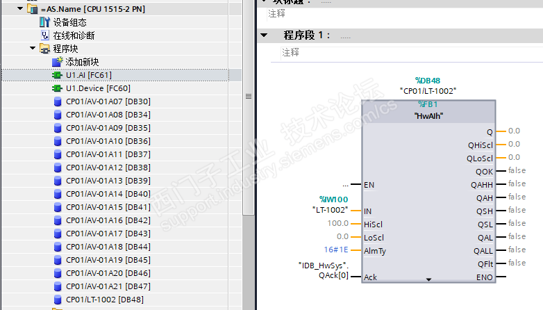 再点击按钮“更新项目”,程序会读取配置文件中的信息生成背景数据块、FC以及对组件的调用并赋予实参。自动生成后的程序参见下图,和手工编程的效果是一样的。