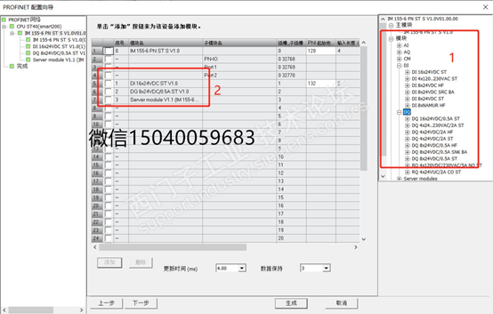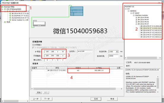 然后组态ET200SP,找到向导组态à选择profinet.按如下步骤操作,注意:155-6与实际固件版本必须一致,PN控制器与ET200SP 的IP地址必须在同一个网段