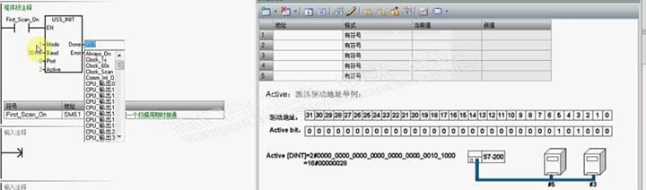 USS_INT初始化功能块,每次改变通信状态时执行一次即可,mode选择通信协议,1为USS,0为PPI协议。Port(=0,CPU集成单独RS485,=1可选CM01信号板上的RS485或RS232),Active激活的驱动地址,看右侧表,v20地址为1,故Active为2。Done(当USS_INIT指令完成后接通)。Error:改输出字节包含指令执行的结果。
