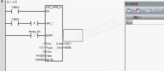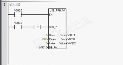 XMT传送请求,如果接通,在每次扫描时会向变频器发送USS_RPM请求(某一时间只能有一条读取或者写入指令处于激活状态,故要循环)。PARAM读取参数地址,index索引号为0(要读取的参数的索引号参数下标IN000)),DB Ptr为数据缓冲区(DWORD,必须提供16个字节缓冲地址,USS_RPM_x 指令使用该缓冲区存储发送到变频器的命令的结果),VW332为当前值。