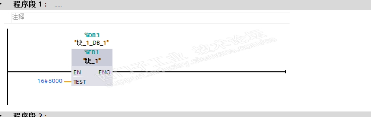 b.使用AT访问将变量TEST拆分为16位BOOL; C.在OB1中调用该FB块,给该FB块的引脚TEST变量赋值,使用AT访问的第16位BOOL变量将Q0.0置位为1。