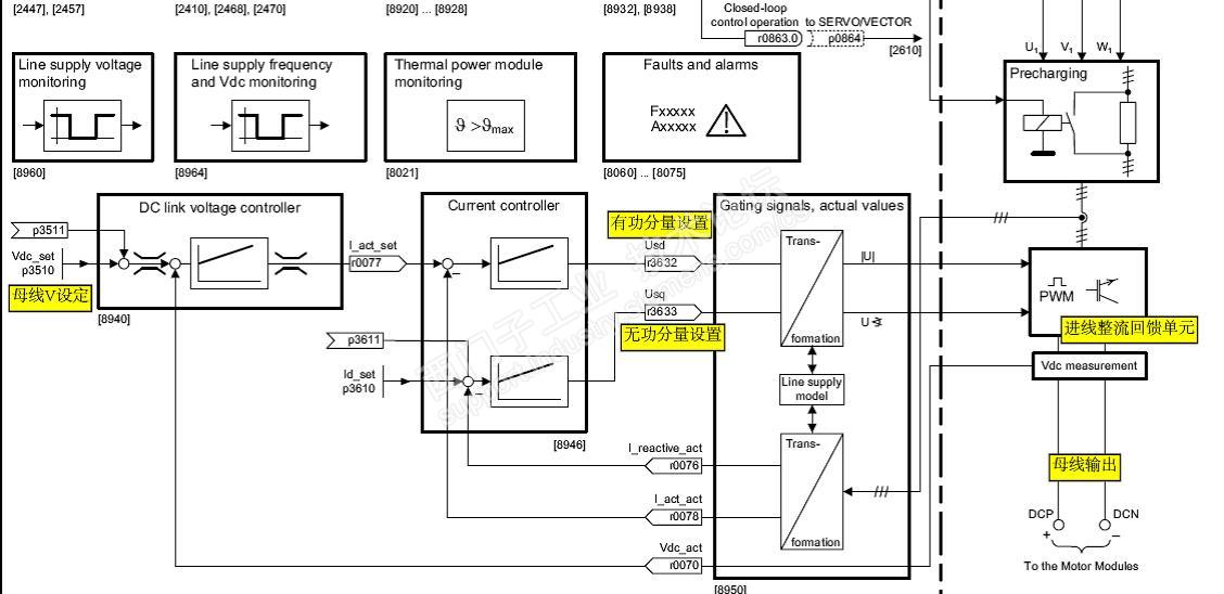 那母线电压下调就好理解了,因为它的进线整流不是二极管,而是IGBT,这是为了满足回馈的功能,但同时它也可以在整流状态时控制导通角来向下调节母线电压。见下图。