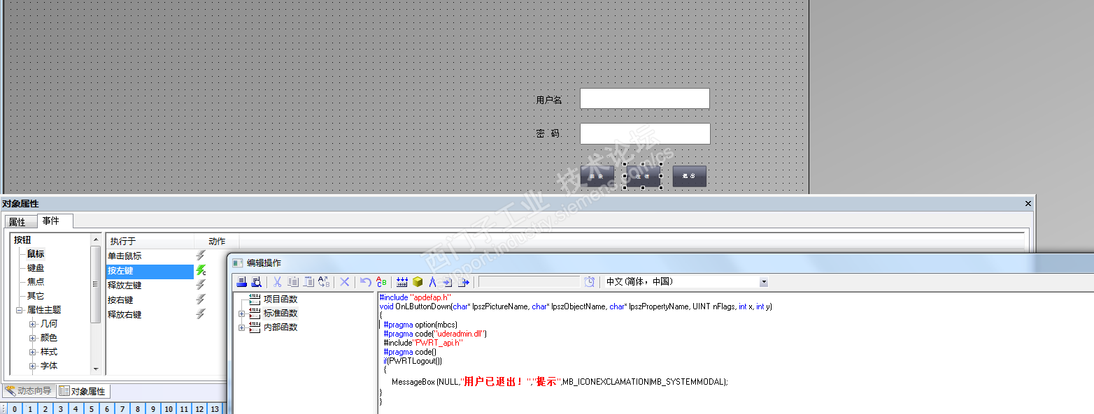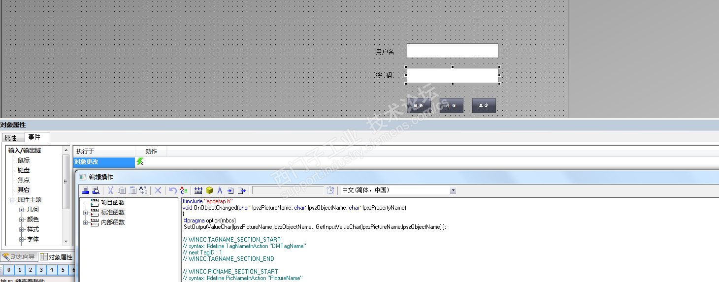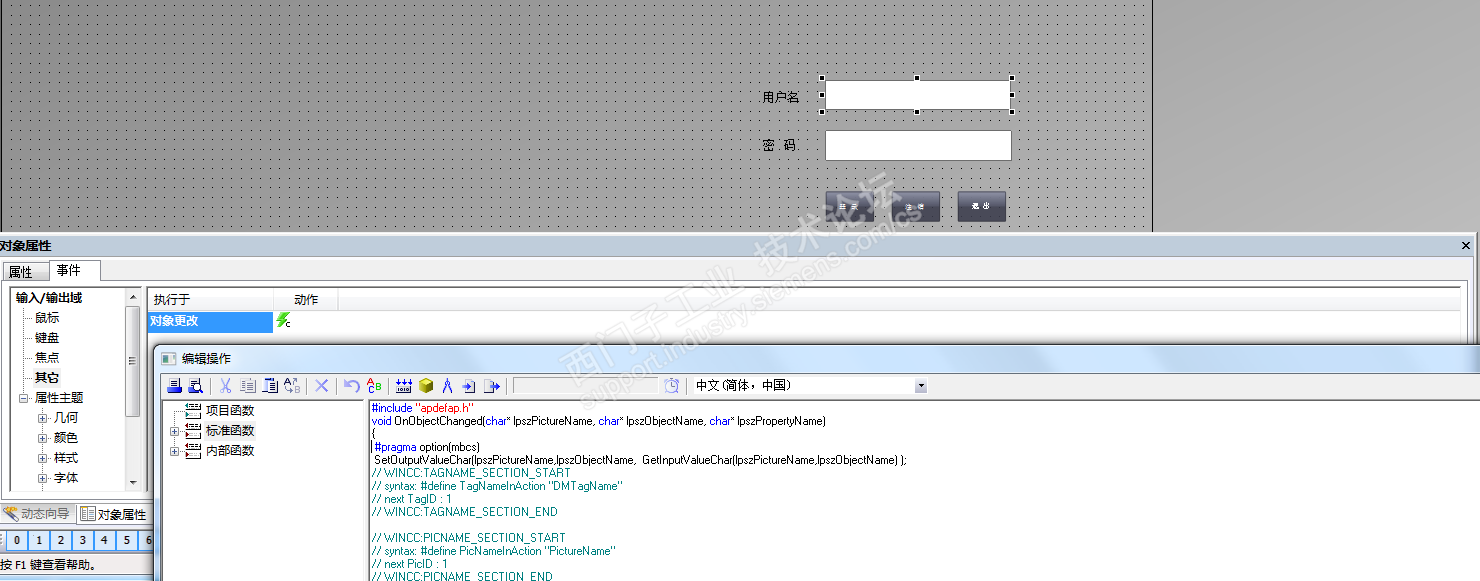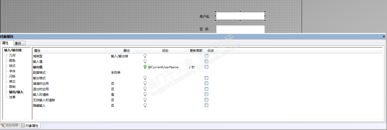 3、更改了第一个IO域的名称为用户名,用户名的对象属性-输入/输出域-输入/输出:输出值连接到了内部变量@CurrentUserName,数据格式更改为字符型更新周期默认2秒,在对象属性-事件-输入/输出域-其他添加C代码如下: