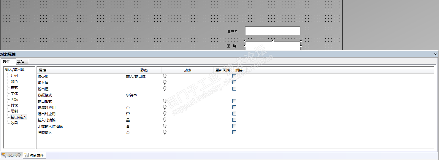 4、更改了第一个IO域的名称为密码,用户名的对象属性-输入/输出域-输入/输出:数据格式更改为字符型;(百度了一下不知道输出值连接到那个内部变量);