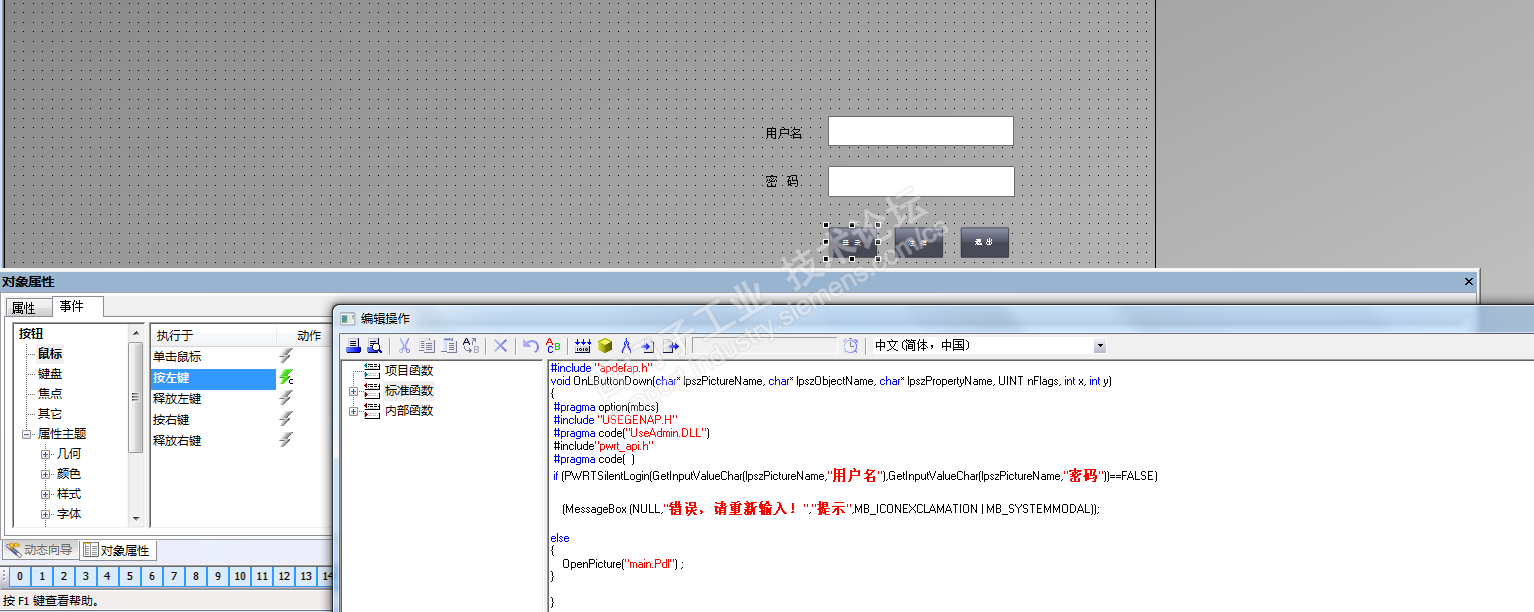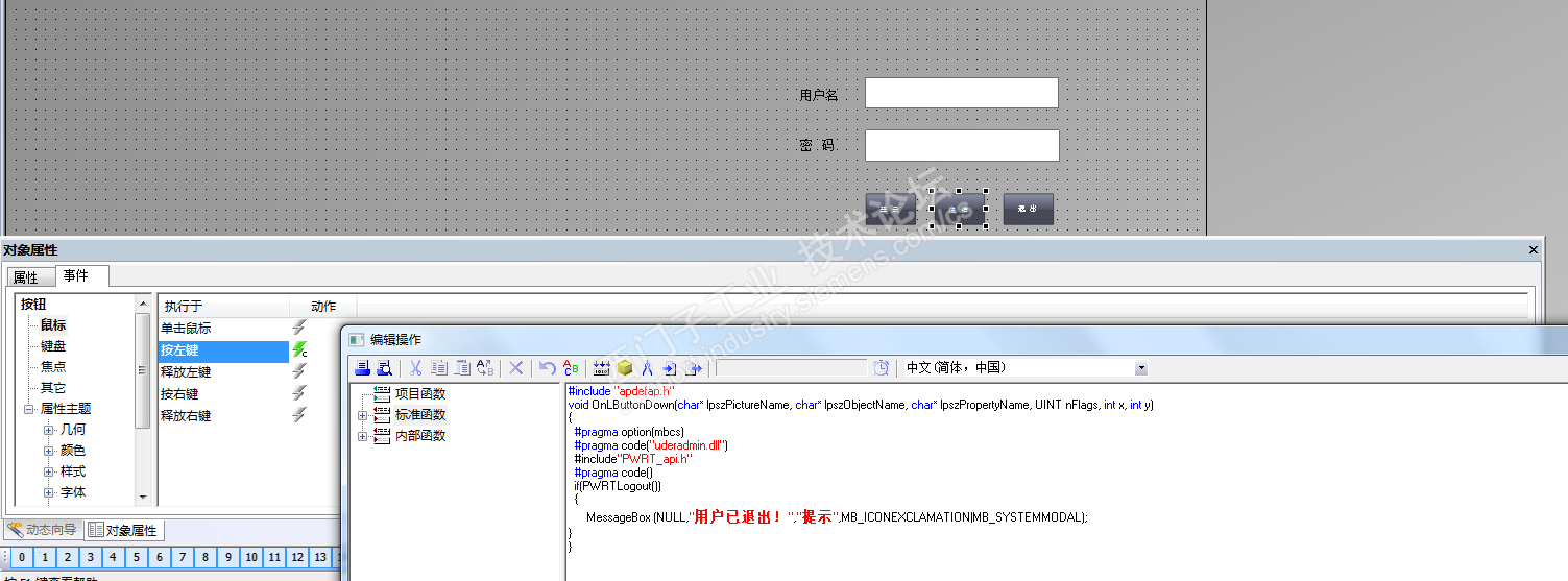 5、在登录按钮对象属相-事件-按钮-鼠标-按左键,添加C代码如下: