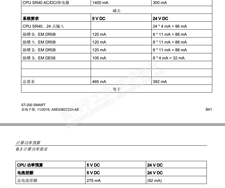 最近事情不多,随手打开200SMART的手册,841页关于功率预算的计算好像有点问题,特此发出来大家一起看一下,如果是我看错了,希望大家指正,如果手册错了还请官网更新一下。这里面关于5V电源的预算,应该是1400-465=935,为什么手册上写的275??