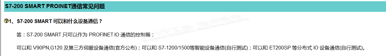 记得S7-200 SMART V2.4版本刚推出来的时候,可能很多人和我有一个想法吧,他是否可以与除了G120和V90PN以外的IO设备通信呢?! 记得当时也发了帖子询问相关问题,我自己下了GSD文件组态是没问题,但是没实物,所以到底实际行不行不得而知,当时把帖子发出来的时候,有的人说不行,说只能和V90做通信,他还说自己测试了才知道不行,我记得我当时问的是300 1200 1500 ET200SP,结果我信以为真啊,也许他忽悠我,也许他真做了,但是他真没做出来,但是今天看了西门子官方文档的说明,貌似支持和ET200SP的IO设备通信。 最后我想说的是,别人说了答案,如果有条件最好自己亲手尝试一下。实践胜于雄辩