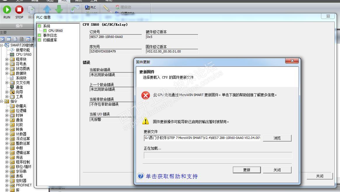 今天想从2.2版本升级到2.4版本,在线升级时候提示“此CPU无法通过Microwin SMART”更新固件,用SD卡升级也失败,红色STOP指示灯一直在闪烁。