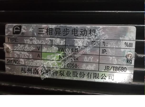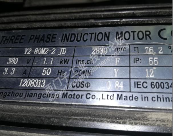 此电机也是1.1KW,额定电流3.3A,如果按照I=P/1.732*0.38*ηcosΦ 计算出来电流为2.6A和第一个图片电机额定电流吻合,查看电机型号,这个电机型号后面的带NFD,电机铭牌电流比第一个图电机电流大0.7A,相对于是1.4KW电机了。