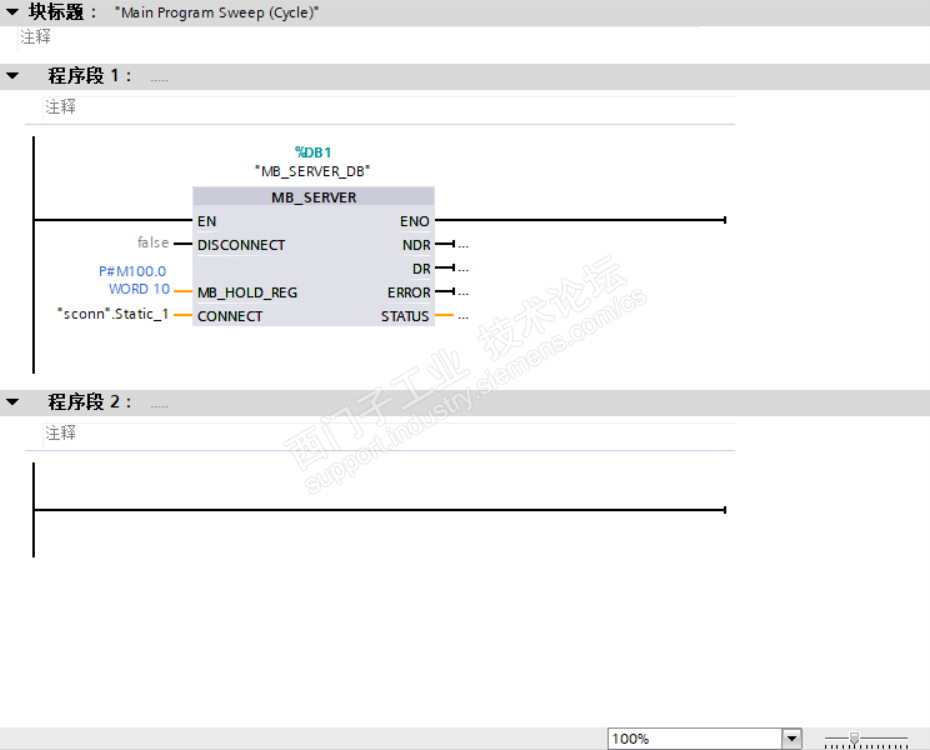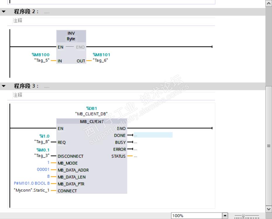 实现2个 S7-1200 CPU 之间MODBUS TCP 通信, a.指定 CPU 1 为客户端,CPU 2 为服务器; b. 客户端读取服务器侧 10001~10008 数据; C. 客户端将读取到的服务器侧数据取反后写回服务器侧 00001~00008