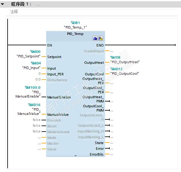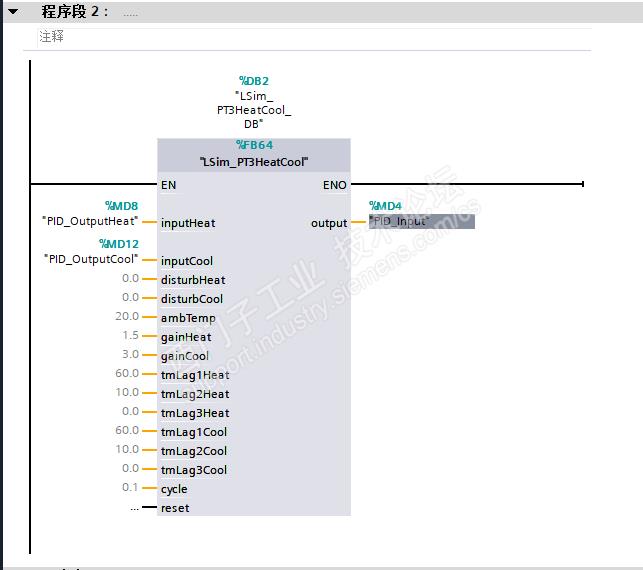 PID_Temp功能测试: a.创建并组态加热及制冷的PID_Temp b.将设定值设为100,反馈值设为50,观察输出变化; c.将设定值设为30,反馈值设为90,观察输出变化; d.下载并安装工艺对象仿真库,其使用方法及下载链接如下:https://support.industry.siemens.com/cs/cn/zh/view/79047707; e.调用“LSim_PT3Heatcool”工艺对象仿真块,对PID_Temp进行自整定。。