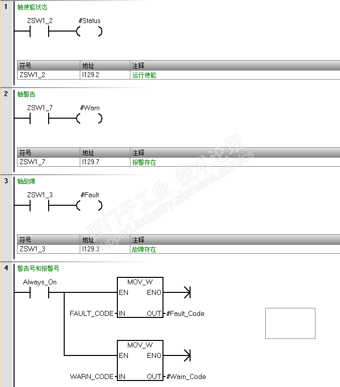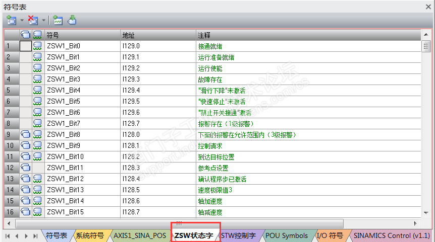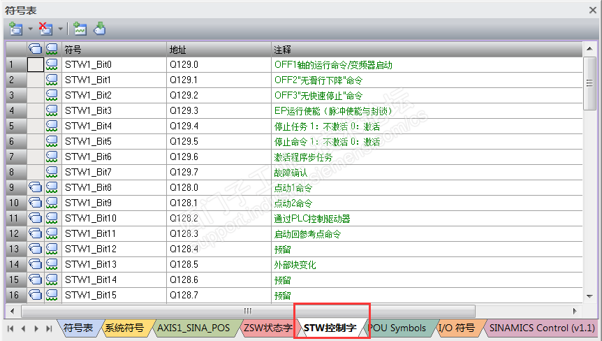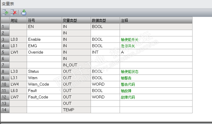 对于报文我的理解就是位置环在驱动器通过控制字来控制伺服,根据之前做完的组态为了方便写程序把I/O点的注释先写好。轴使能的控制主要是报文的第一字节,注意高低位的问题