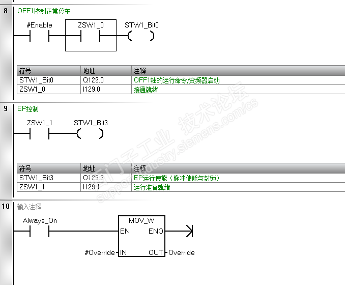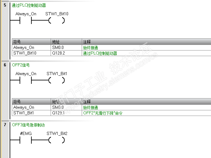 我的时序是这样的,首先置位STW1_Bit10这是PLC控制伺服前提条件。根据进给轴的应用不会需要OFF2自由停车方式。所以OFF2也是始终为True。OFF3是紧急停车方式由急停控制。