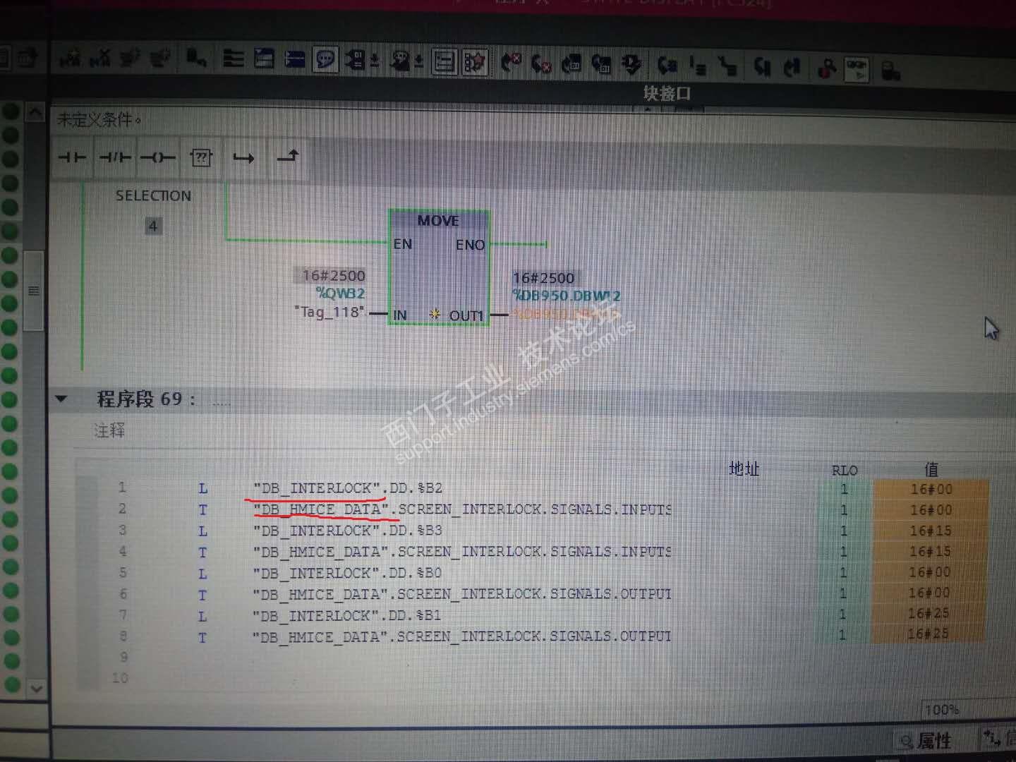看了下PLC程序图一中两个化横线的数据块里的内容交换,得出结论DB_HMICE_DATA是触摸屏的数据。