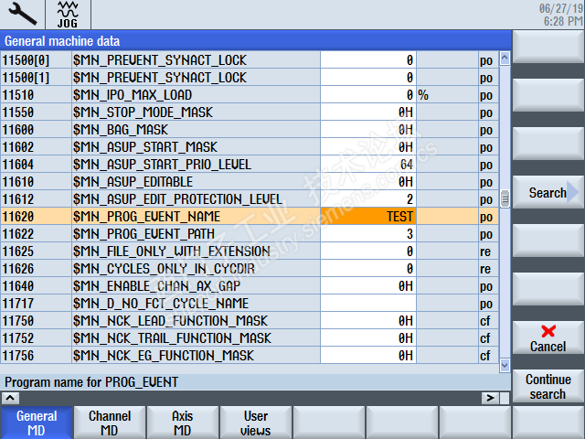 在机床通用数据中搜索MD11620,并输入自建的子程序名