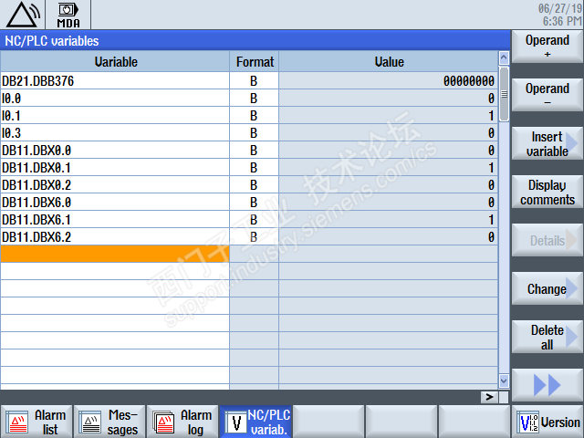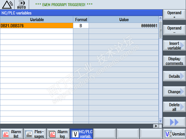 切换到诊断界面,在NC/PLC变量界面输入PLC接口:DB21.DBB376,可以看到DB21.DBB376的0位由0变为1