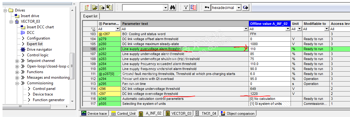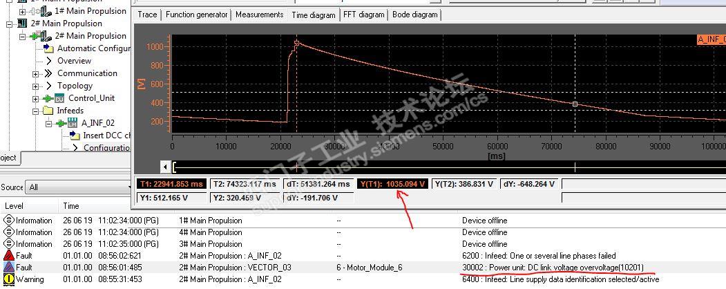 故障:其中一台,在默认AFE 的(p3400.0参数)设置在smart mode下工作正常,但是当AFE infeed设置operating mode(p3400.0)为”active mode”时,一上电就报”F30002 DC-Link overvoltage”,改回“smart mode”后正常。同时,对比本台VFD的infeed参数,与其它四台基本一样.