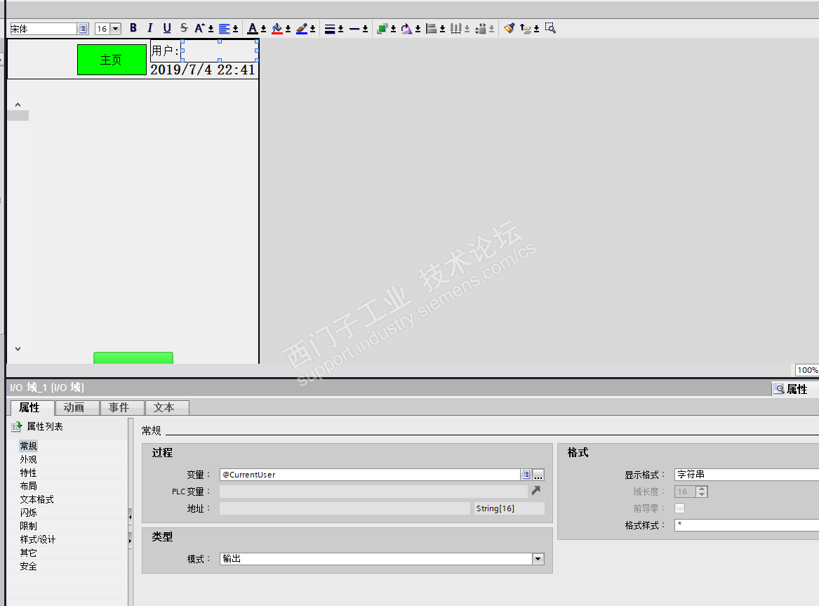 下图为组态界面,组态了IO域并关联wincc系统变量@CurrentUser