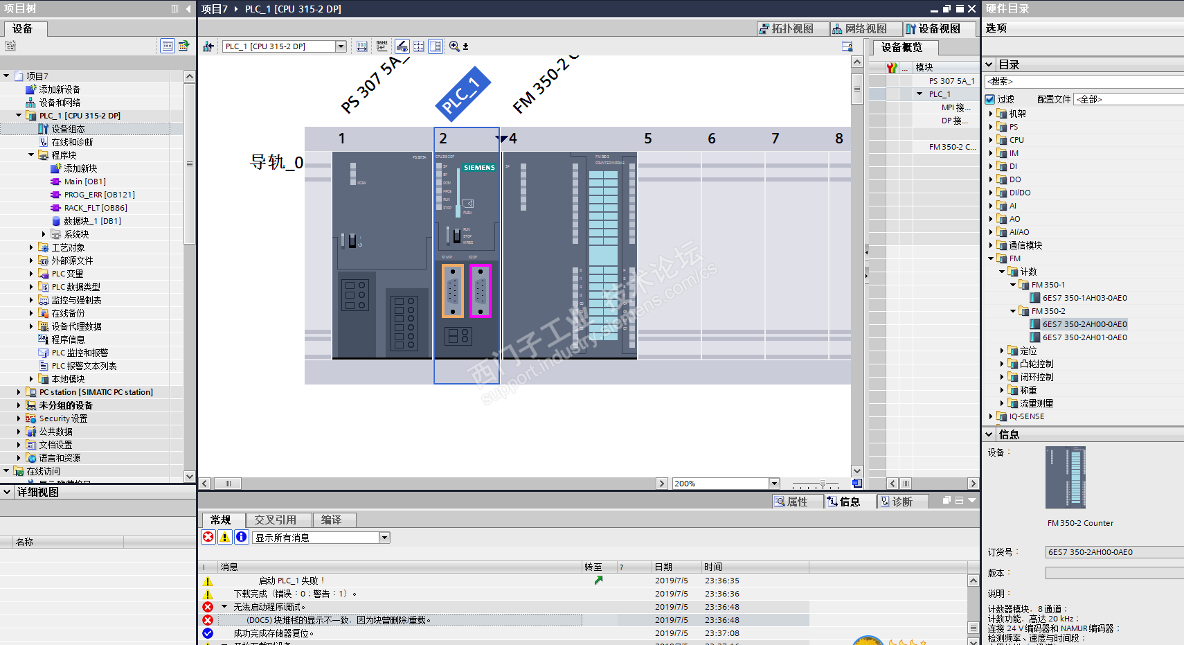 你好工程师,我用315 PLC组态完成报错,硬件和组态软件是吻合,CPU 315 2DP 版本是2.6,输入模块是22OV 16点输入 321-1FH00-0AA0 高速计数器是FM 350-2 350-2AH00-0AE0 谢谢工程师