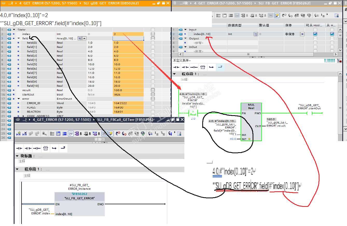 工程师你好:数据块index修改值为2 在FB中怎么变成4.0?下图画圈的4.0,#”Index[0..10]”=2