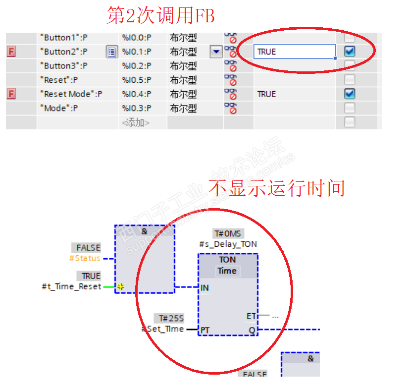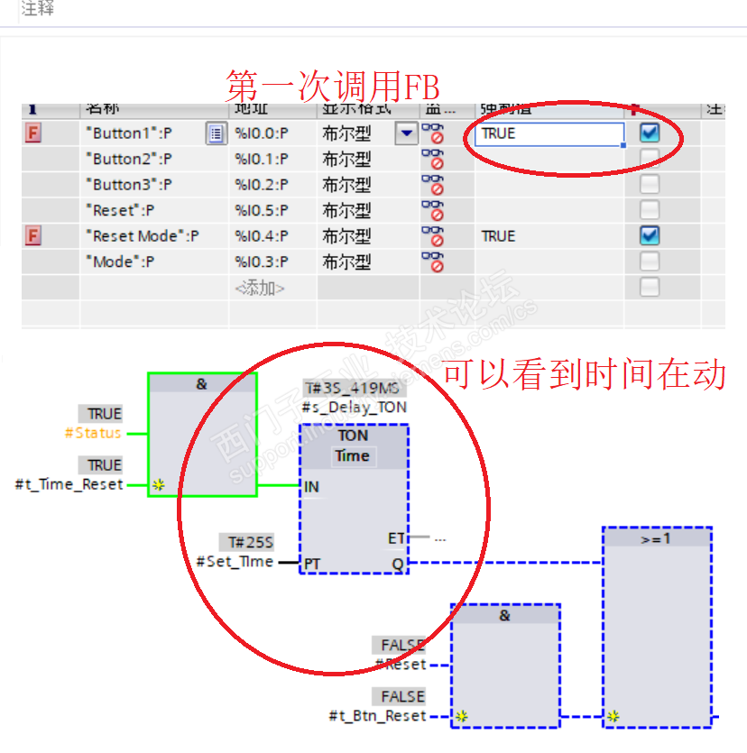 在一个OB中,多次调用同一个FB,为什么在仿真的时候只有第一个调用能在FB的梯形图中实时在线看到运行的情况,而第二个、第三个却看不到(运行结果是对的)?