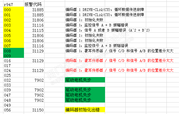 S120驱动器带动电机(原先为闭环控制P1300=21),运行中偶尔出现报警F31129(编码器 1:霍耳传感器 / 信号 C/D 和信号 A/B 的位置差分太大),将控制改为开环(P1300=20 无编码器速度控制),正常运行。原计划待白天停机检修时更换编码器或电机,可运行了24小时左右,又出现编码器相关异常信息(F31116,31806,31115,31116,31885,7902,31550)见附件详细信息。